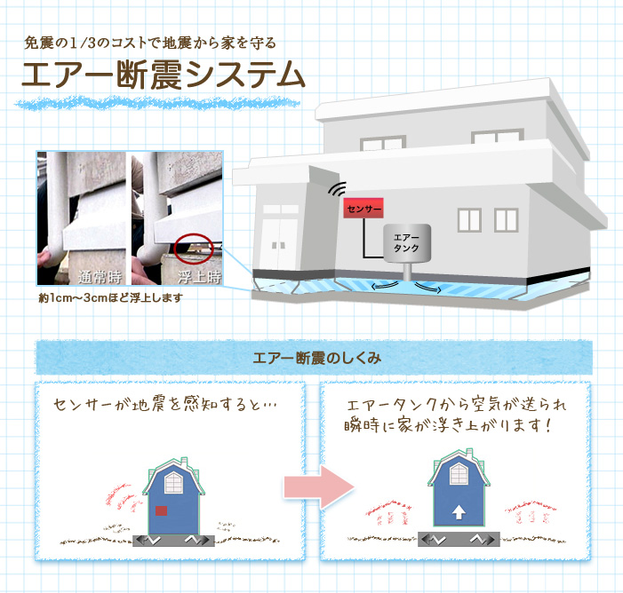 エアー断震システムとは、地震が起きると瞬時に何トンもある重たい家をに浮かせ、大きな地震の揺れも回避するまったく新しい地震対策です。